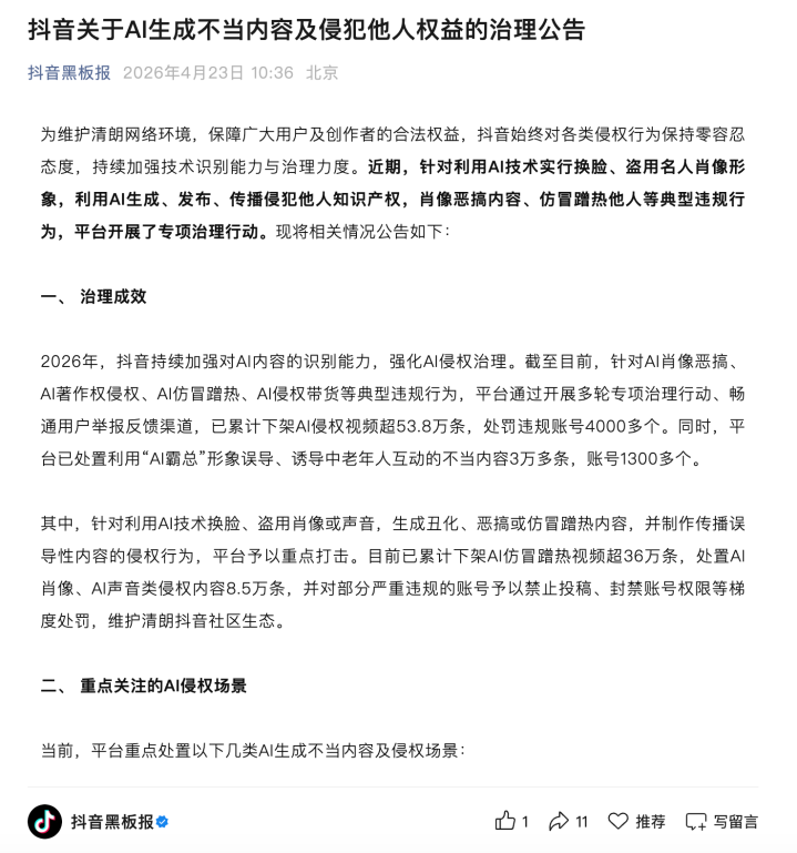 凤凰网科技讯 4月23日,抖音官方发布公告:近期,针对诈骗AI技能现实换脸、盗用名东说念主肖像形象,诈骗AI生成、发布、传播侵略他东说念主学问产权,肖像恶搞本体、仿冒蹭热他东说念主等典型违章行径,平台开展了专项陆续行径。