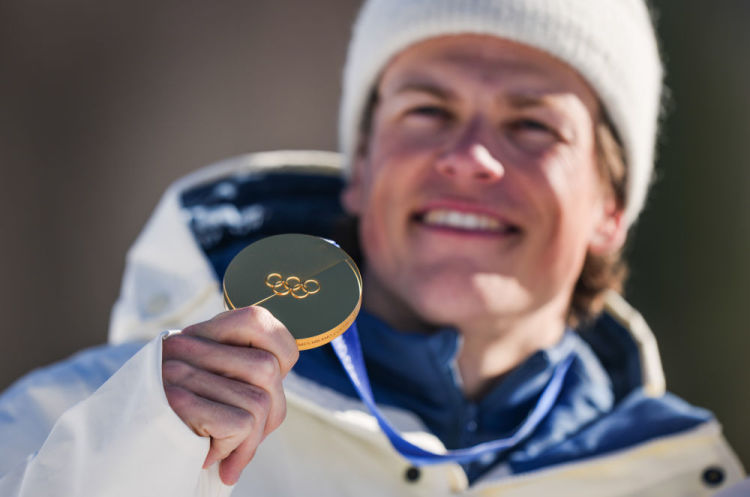 2月15日,挪威队选手克莱博在越野滑雪男人4X7.5公里勉力授奖庆典上。新华社记者 彭子洋 摄