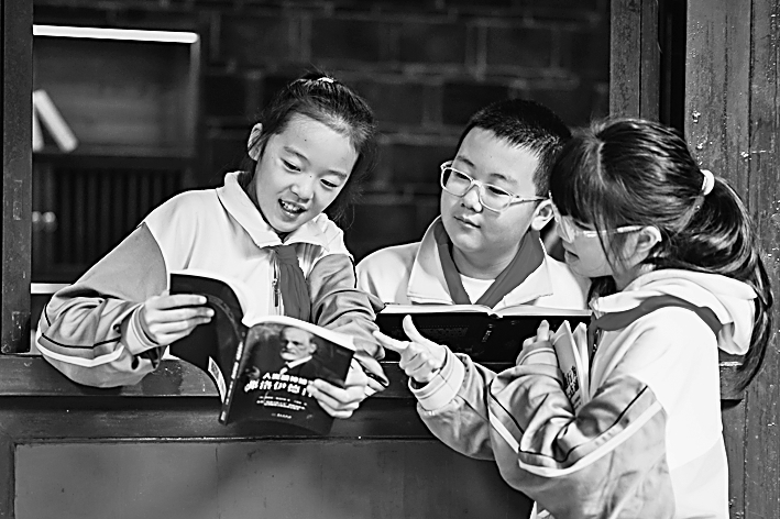 贵州省玉屏侗族自治县印山书院,印山民族小学学生在看书交流。胡攀学摄/光明图片