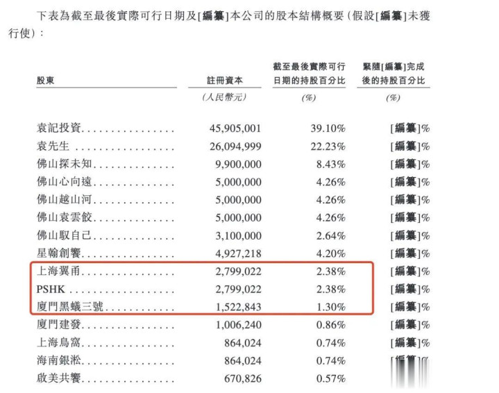 限定招股书终末本色可行日历,PSHK、上海翼甬、厦门黑蚁三号合共捏有袁记食物6.06%股权。