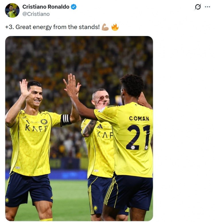 澳门娱乐app C罗社媒晒与进球元勋科曼庆祝合照:拿下三分,现场球迷活力皆备