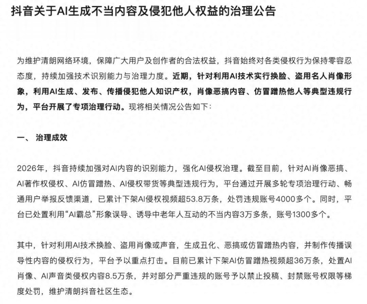 澳门十大娱乐网站 抖音: 累计下架AI侵权视频超53.8万条